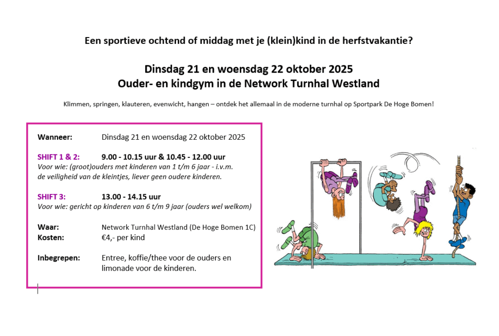 Houdt de website en onze facebookpagina in gaten voor de volgende editie van de ouder en kind gym. Traditioneel worden er in de herfst- kerst- en voorjaarsvakantie ouder-kind gym gepland.